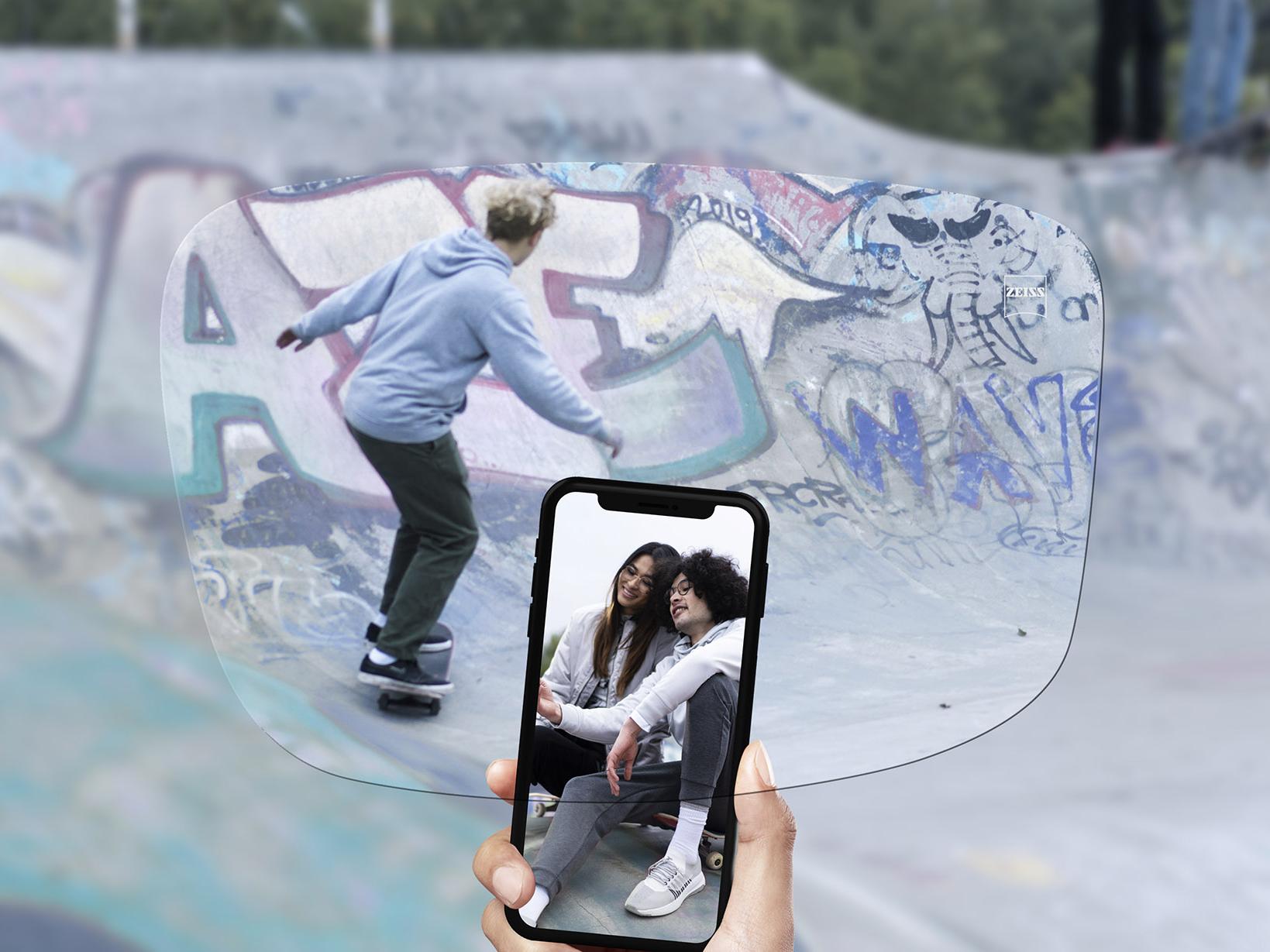 Двоє молодих людей, усміхнена жінка з довгим темним волоссям і хлопчик із кучерявим чорним волоссям, усі в окулярах ZEISS SmartLife, дивляться на екрани своїх телефонів.
